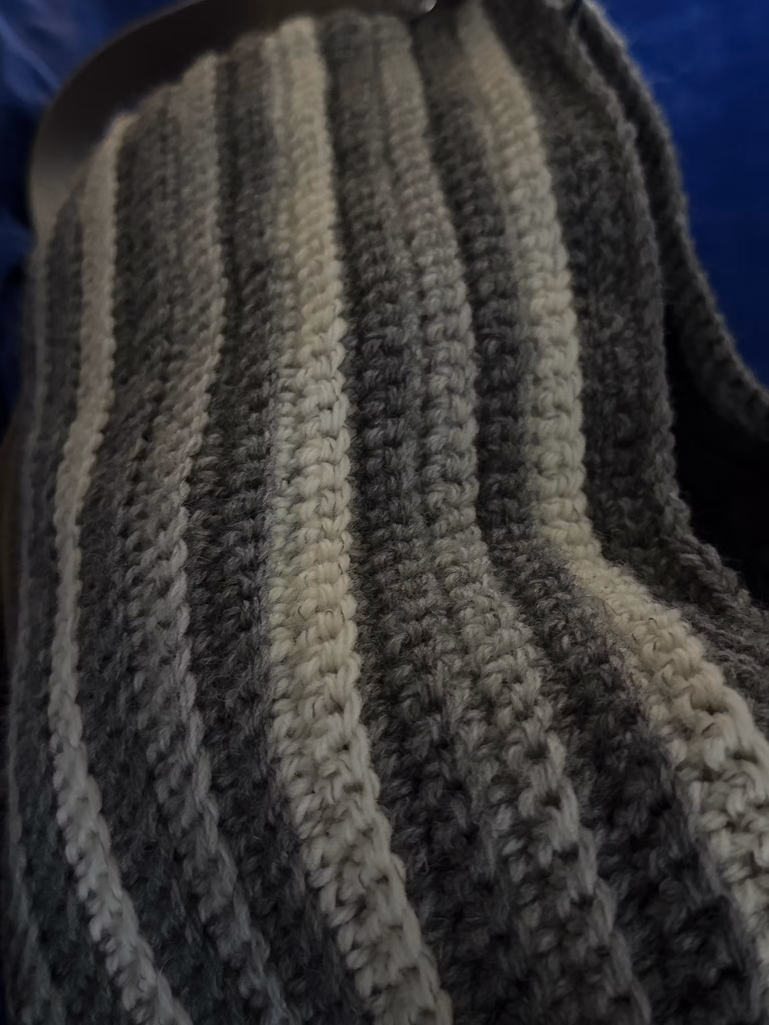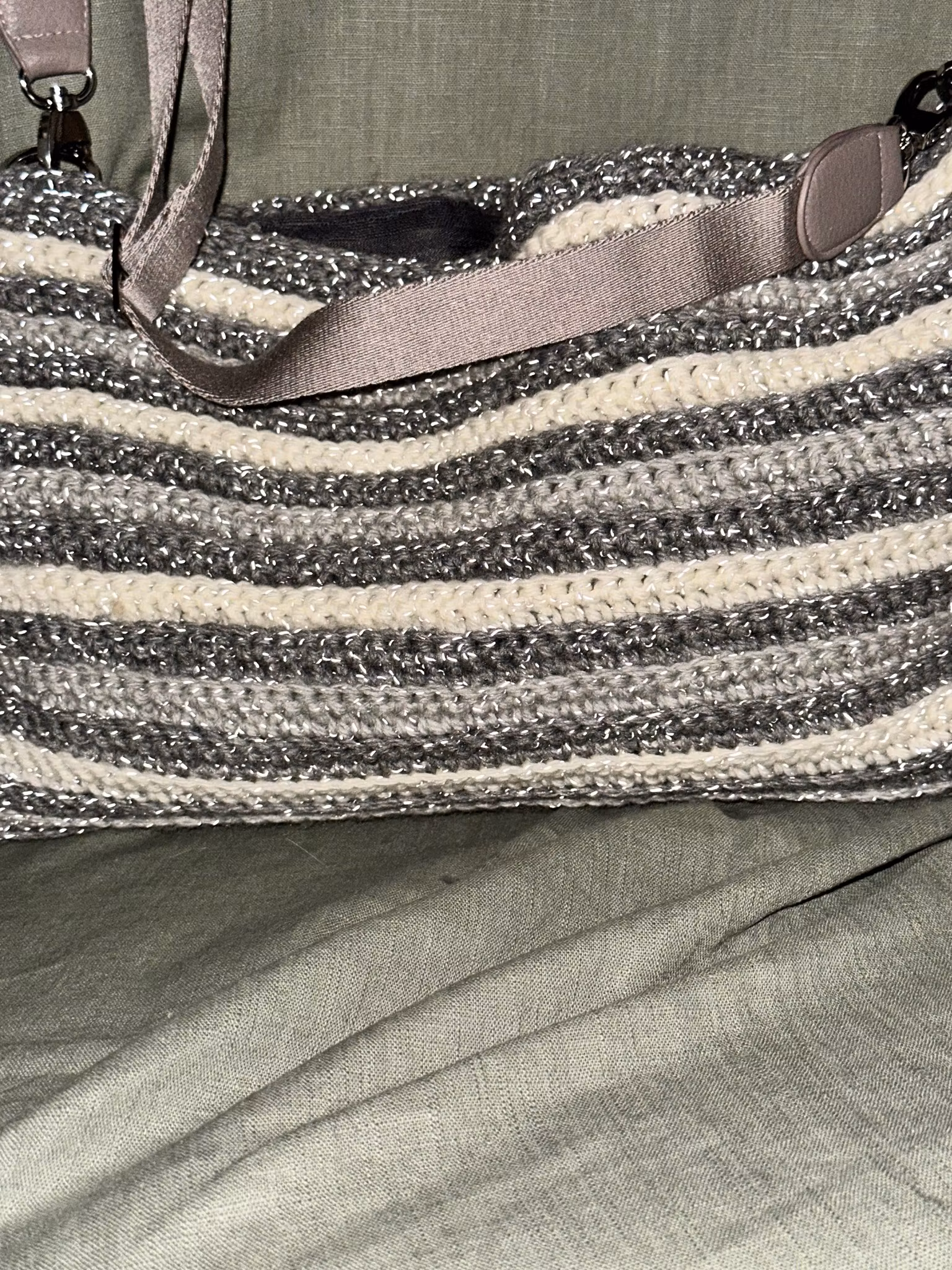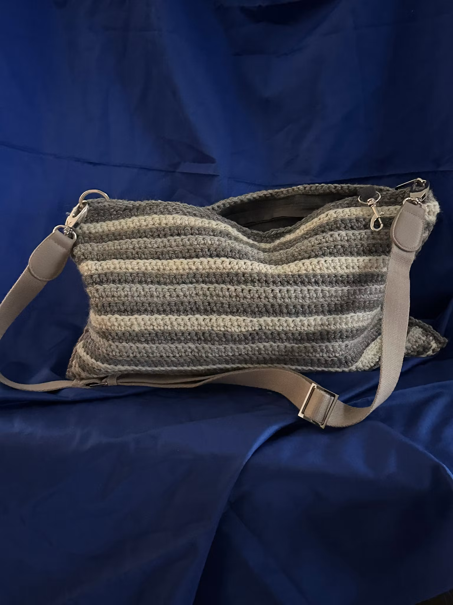 En sydd väska med dragkedja, justeringsbar axelremsa och nyckelhållare inuti. Insidan är klädd i lintyg. Väskan har en virkad framsida med reflektiv garn, som kommer att få dig att synas i mörker!