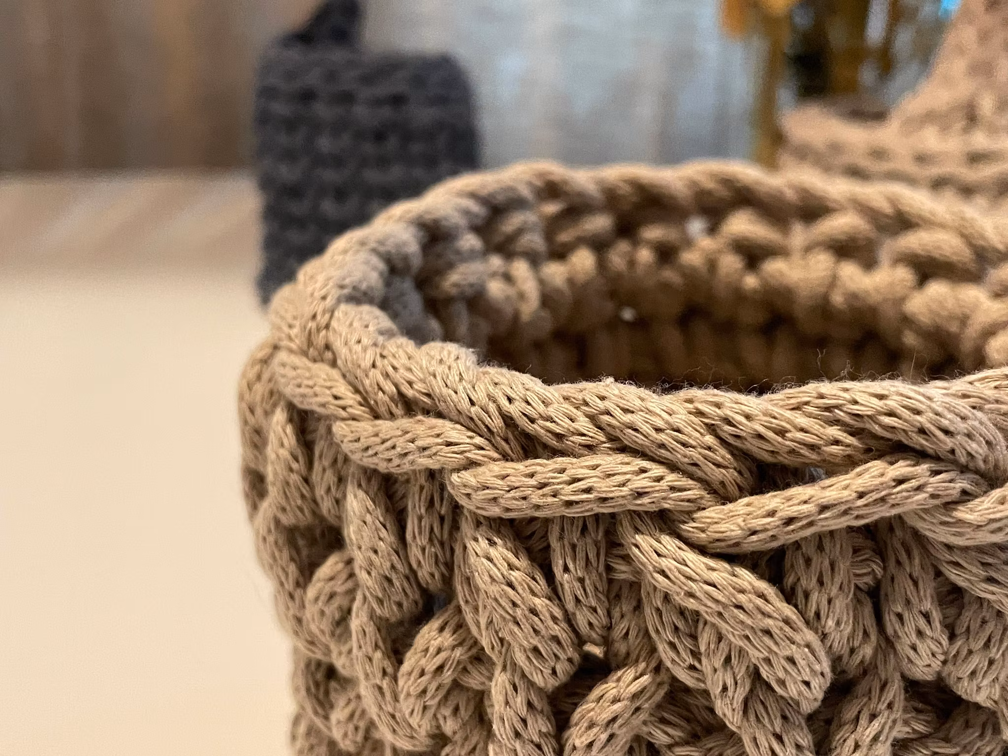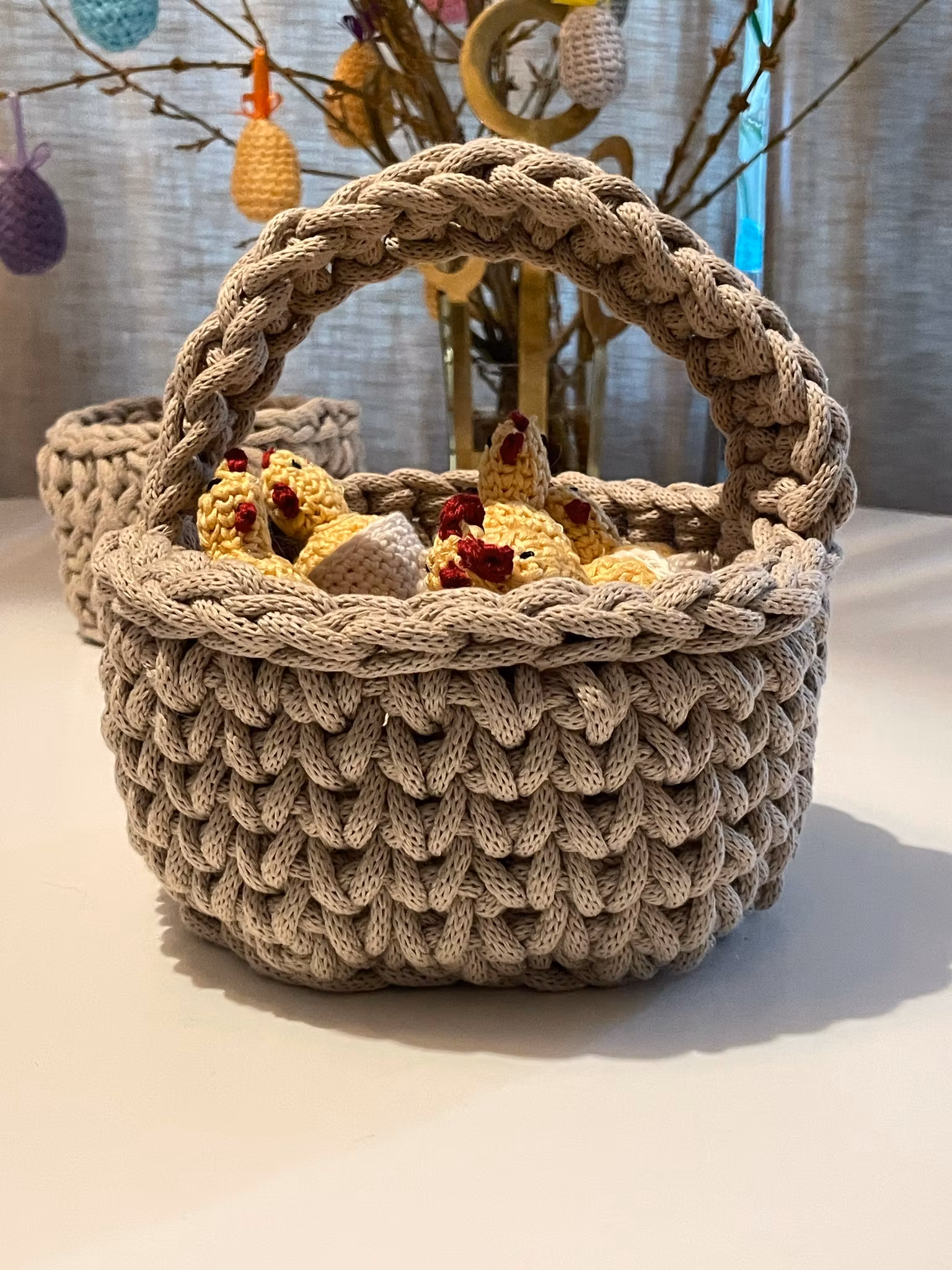 Virkad Korg med Handtag 450 kr I lager. Lägg i korgen Beskrivning En virkad korg i 80% bomull- 20 % polyestergarn. Stadig och hållbar, kan hålla allt från badrumsartiklar till leksaker och äg för påsken.