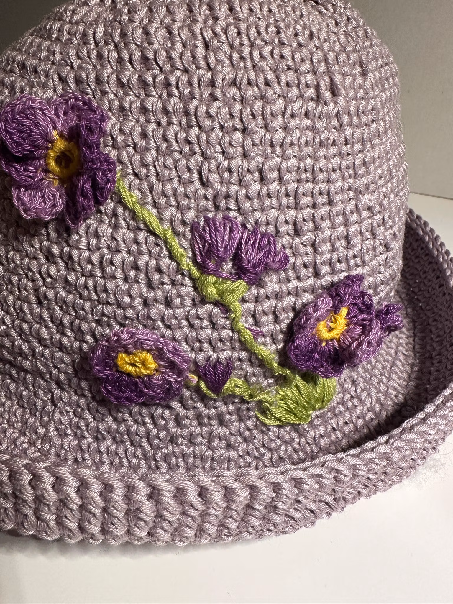 Hatt med lila blommor 299 kr I lager. Lägg i korgen Beskrivning En hatt virkad i 100% bomull med små lila blommor. Omkrets 56 cm, höjd 18 cm + brätte 7 cm.
