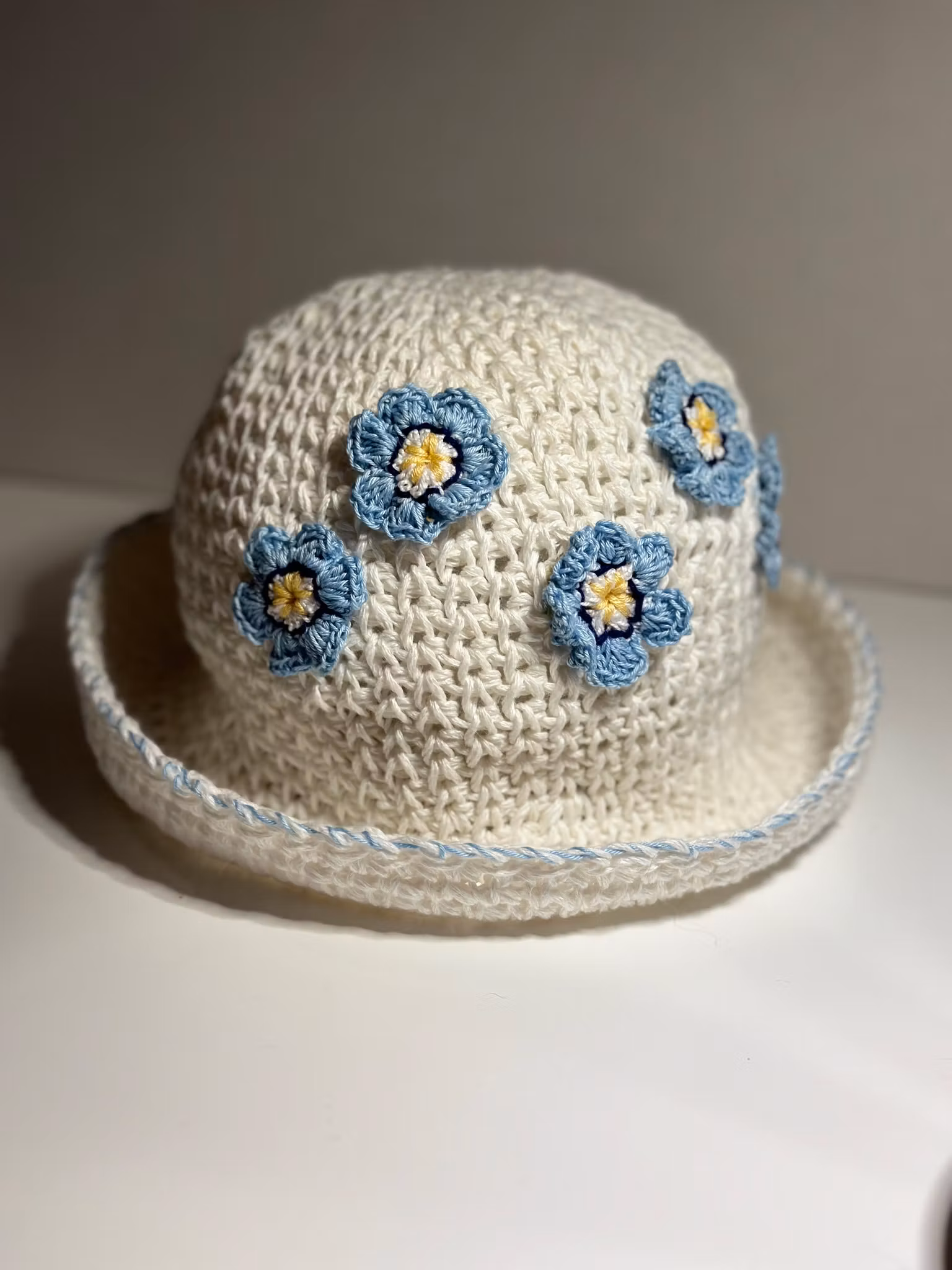 Vit hatt med blå blommor med blå kant 299 kr Produkten är tyvärr slut i lager. :( Beskrivning En hatt virkad i 100% bomull med små blommor. Omkrets 44 cm, höjd 14 cm + brätte 5,5 cm.